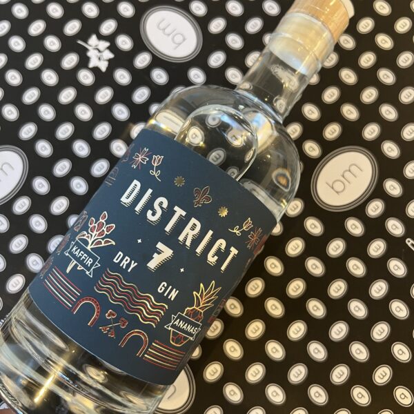 « District 7 », un gin artisanal surprenant et gourmand, infusé avec des feuilles citron kaffir et de l’ananas, concocté rien que pour nous par les dames de la maison Canopée, à Morges ! Voluptueux, fruité, légèrement épicé, à glouglouter sur notre terrasse ou à acheter pour le siroter peinard chez vous et ébahir vos hôtes ! Bouteille de 50cl avec « mode d’emploi ».